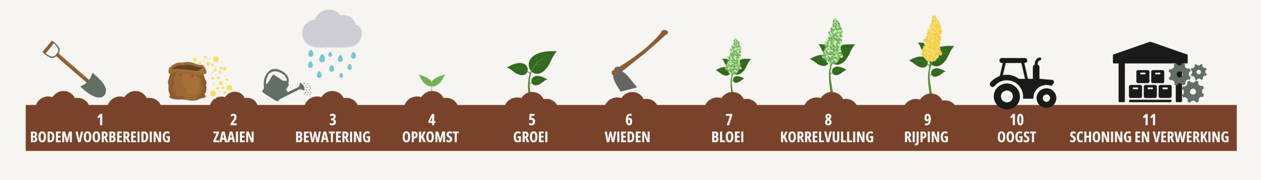 Wil je meer weten over hoe onze telers de Nederlandse quinoa telen? Hieronder worden de verschillende stappen in het teeltproces uitgelegd.